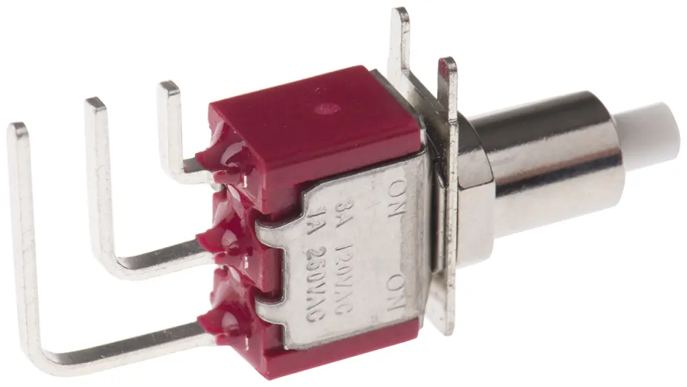 Interruptores de botón pulsador de encaje a presión de RS disponibles con terminal de montaje en PCB o soldadura. Las aplicaciones incluyen telecomunicaciones, dispositivos y equipos de telecomunicaciones