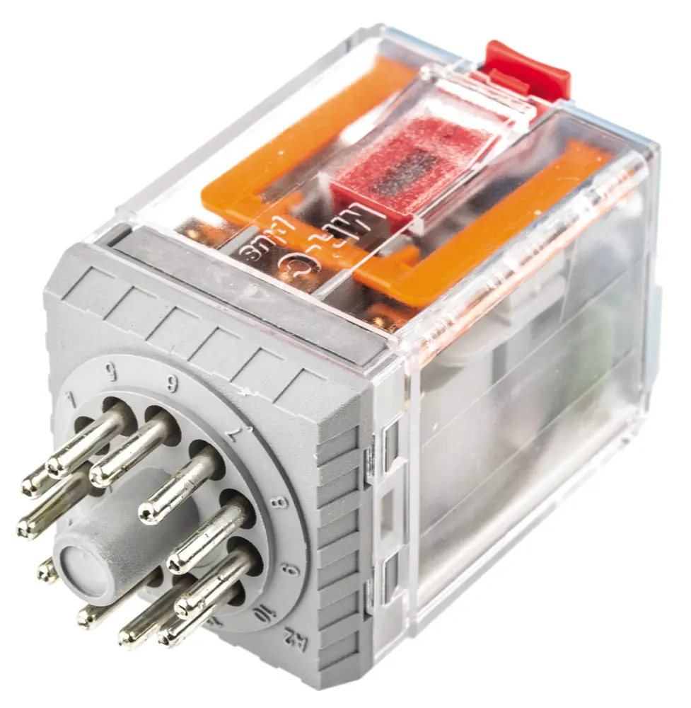 El relé sin enclavamiento de montaje enchufable de 3 polos RELECO serie MRC tiene una configuración de contacto de 3PDT. Se acciona con una coil 230VAC y corriente de conmutación 10A. Este relé tiene un botón de prueba, indicador LED e indicador mecánico. Botón de prueba con código de color de doble función: pulsar para intentar y soltar para enclavar