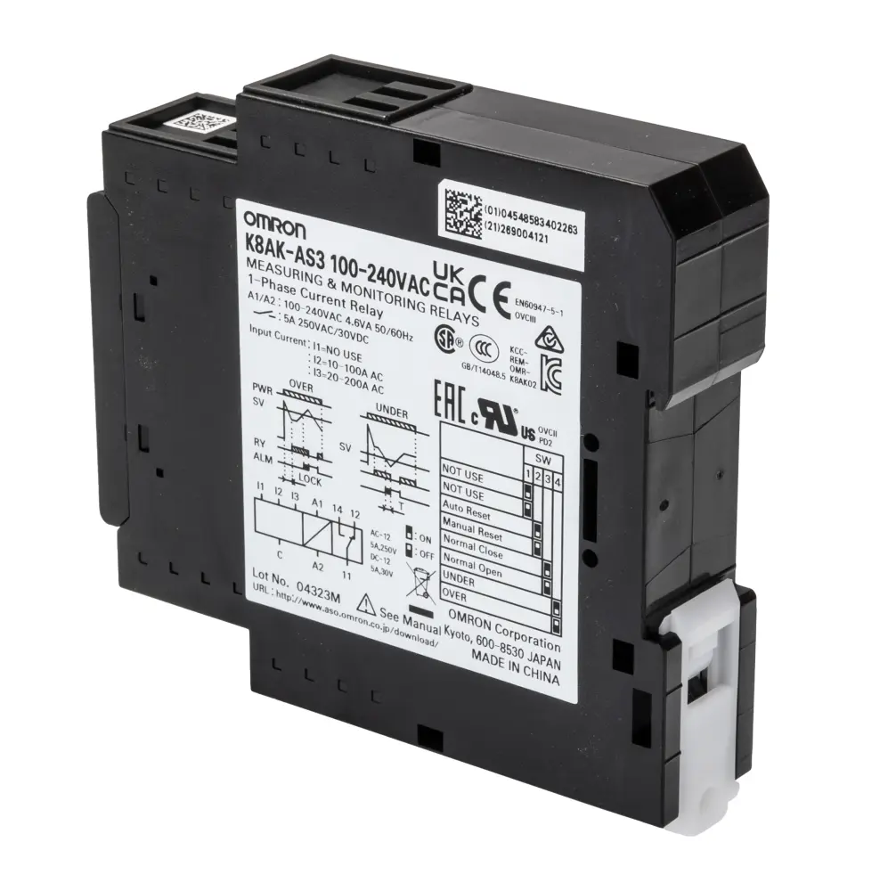 Relé de monitorización Omron serie K8AK-AS, configuración de contactos SPDT, montaje en carril DIN – K8AK-AS3 100-240VAC